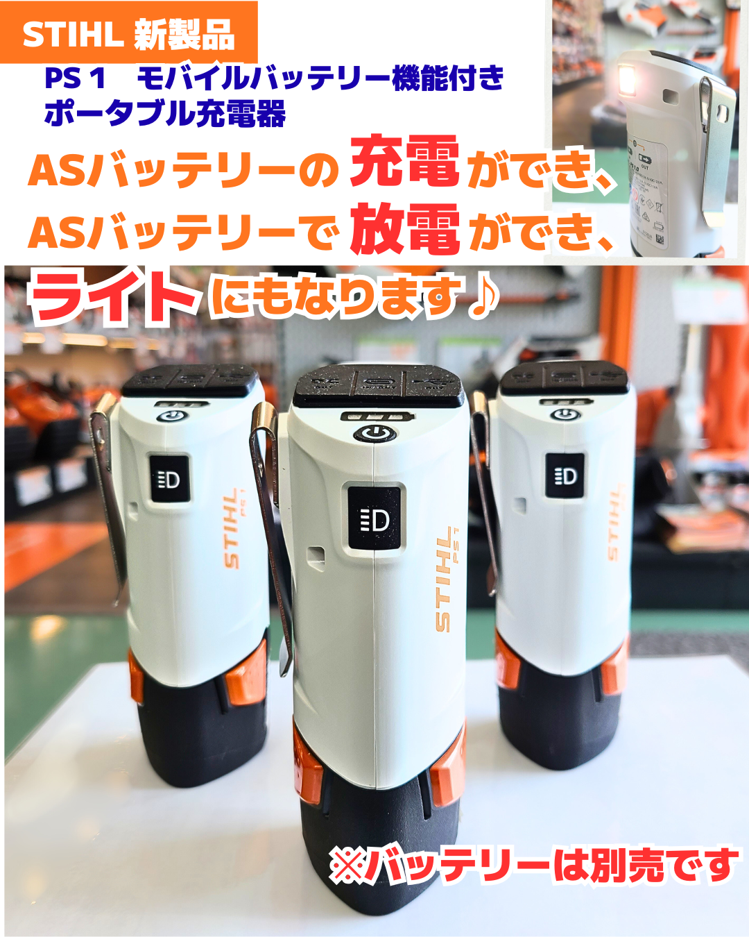 STIHL 『PS1 モバイルバッテリー機能付き ポータブル充電器』は、ASバッテリーの充電ができ、ASバッテリーで放電ができ、ライトにもなります☆