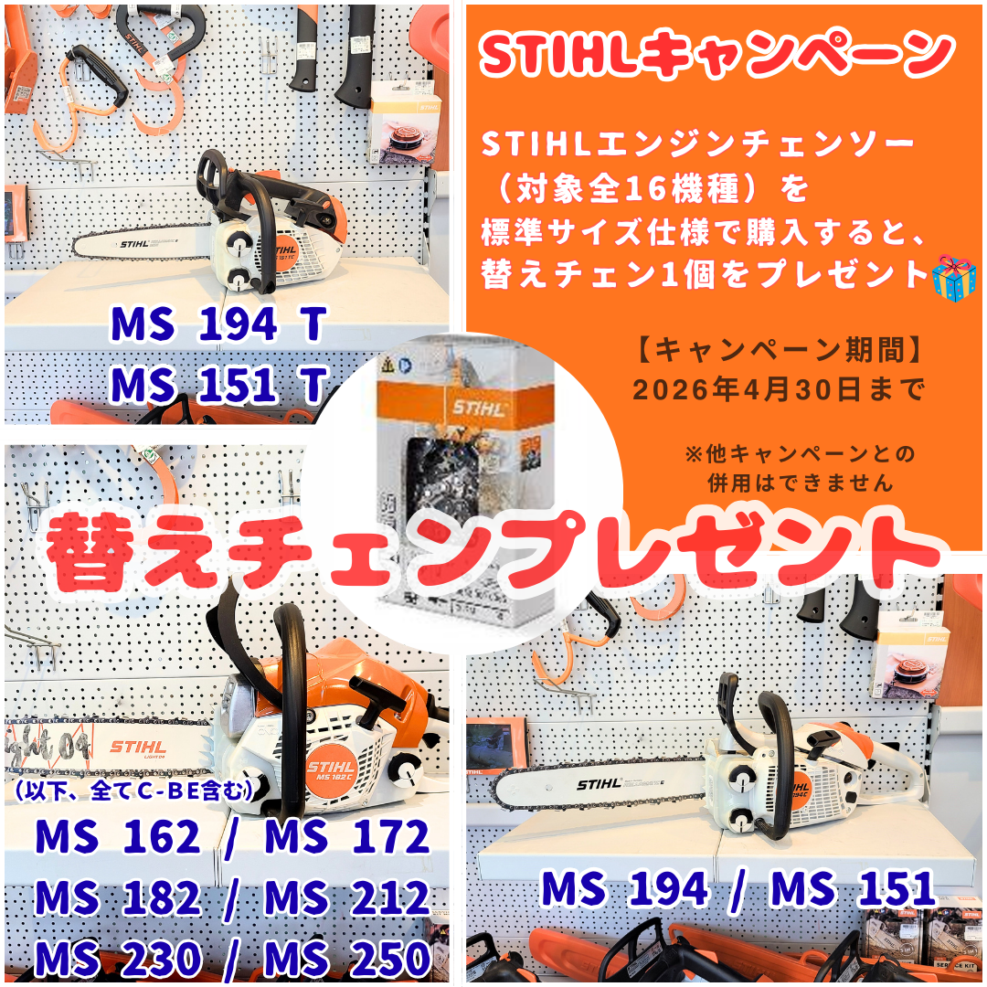 STIHL対象エンジンチェンソーを標準サイズ仕様で購入いただくと、替えチェン1個をプレゼント🎁